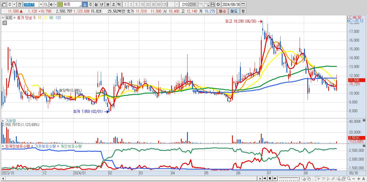 - 워트 (11,500원 ▲ 10.79% , 시총: 1,854억, 거래량: 2,550,797, 거래대금:296억)