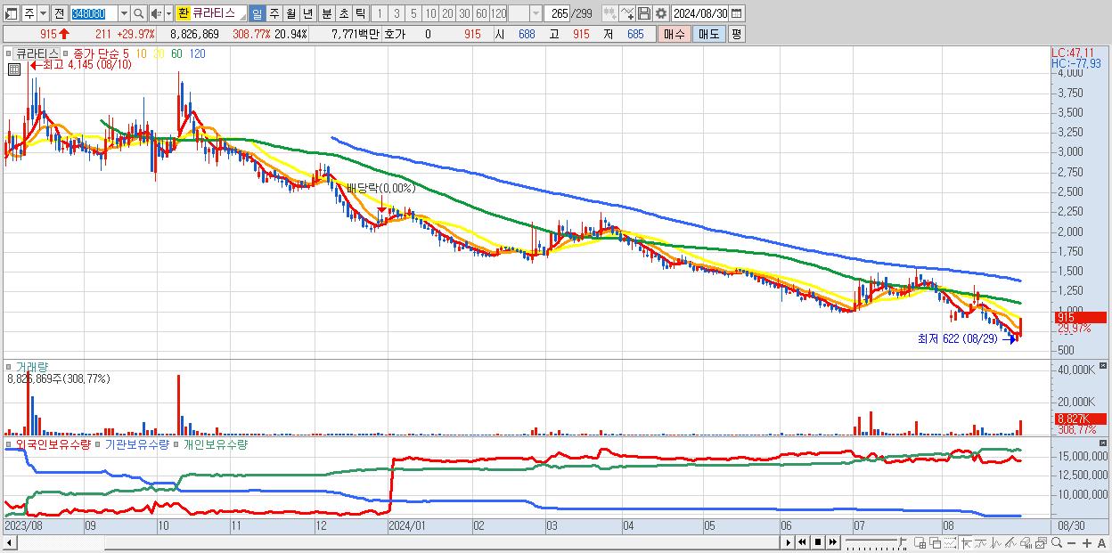 - 큐라티스 (915원 ▲ 29.97% , 시총: 386억, 거래량: 8,826,869, 거래대금:78억)