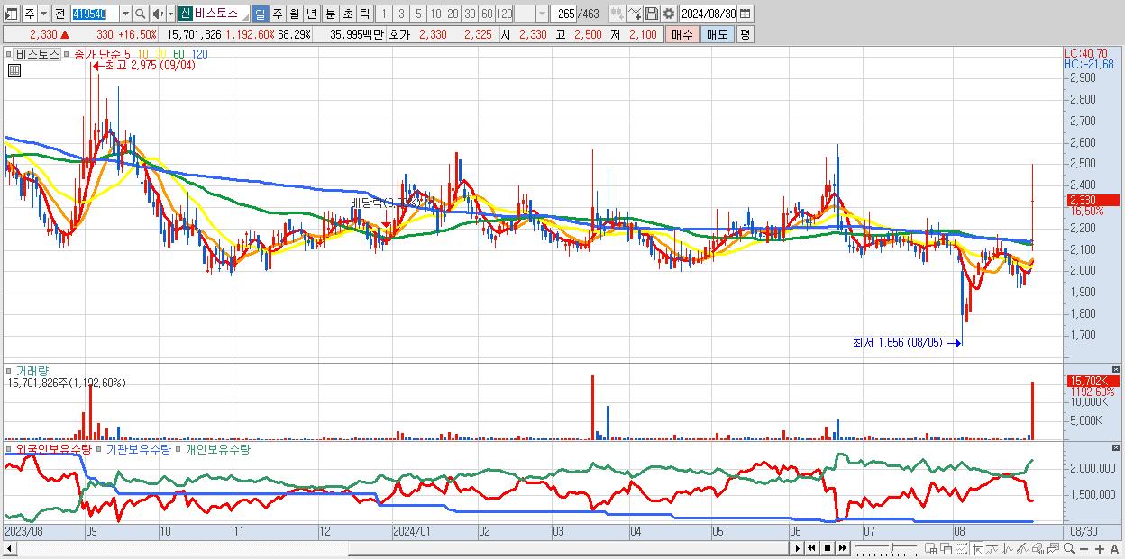 - 비스토스 (2,330원 ▲ 16.5% , 시총: 536억, 거래량: 15,701,826, 거래대금:360억)