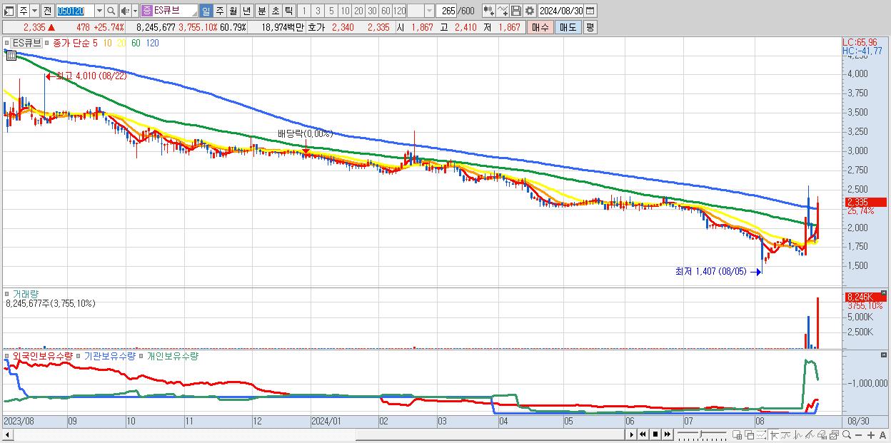 - ES큐브 (2,335원 ▲ 25.74% , 시총: 317억, 거래량: 8,245,677, 거래대금:190억)
