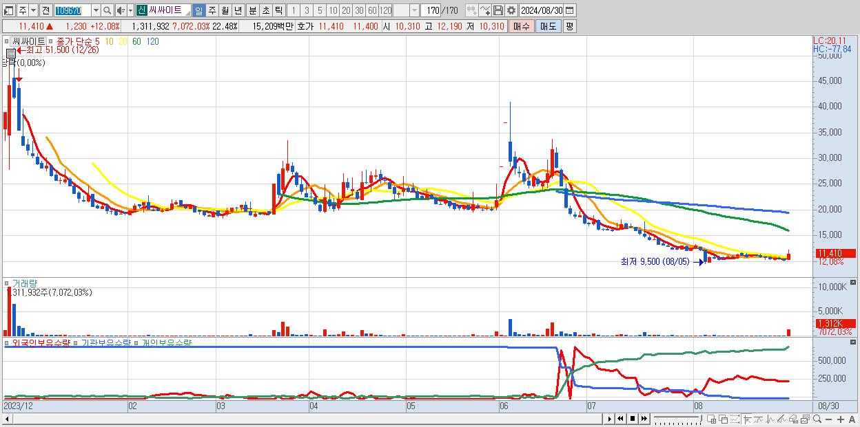 - 씨싸이트 (11,410원 ▲ 12.08% , 시총: 666억, 거래량: 1,311,932, 거래대금:152억)