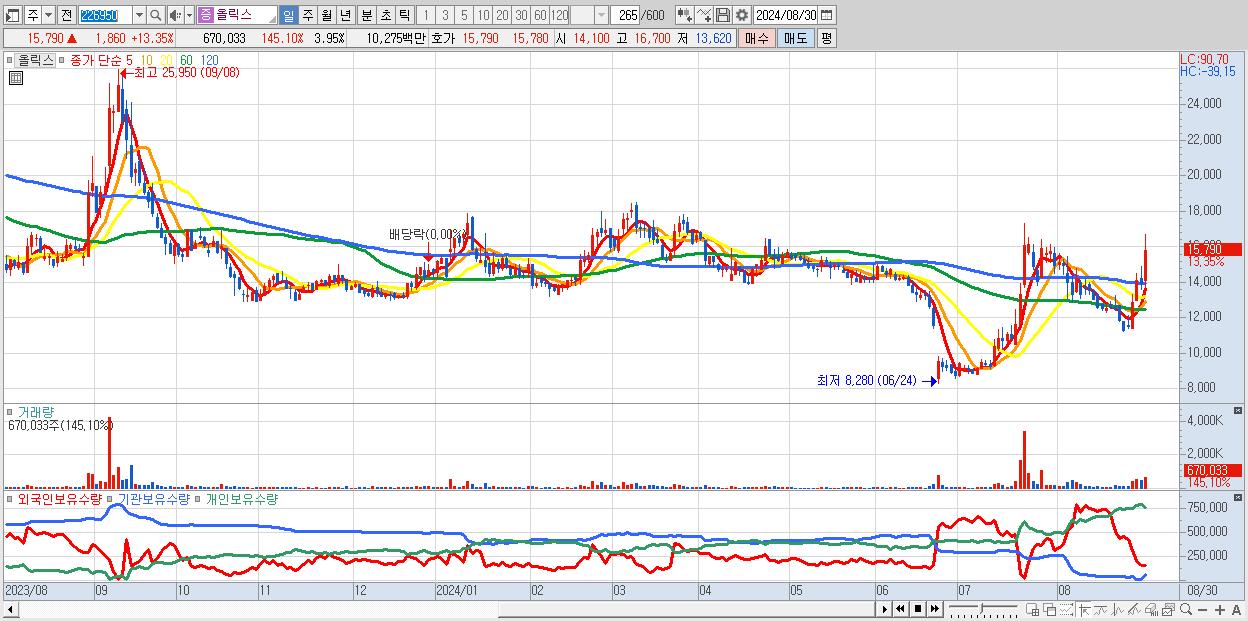 - 올릭스 (15,790원 ▲ 13.35% , 시총: 2,680억, 거래량: 670,033, 거래대금:103억)