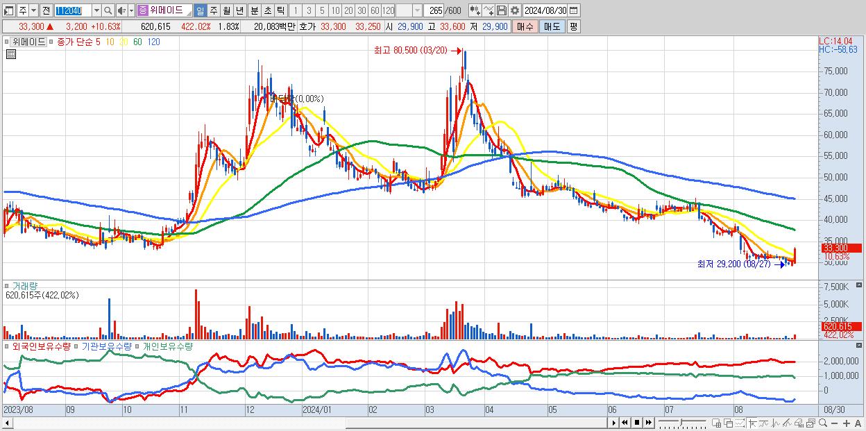 - 위메이드 (33,300원 ▲ 10.63% , 시총: 11,305억, 거래량: 620,615, 거래대금:201억)