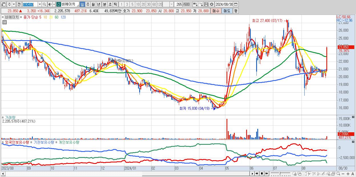 - 비에이치 (23,850원 ▲ 16.34% , 시총: 8,220억, 거래량: 2,205,578, 거래대금:498억)