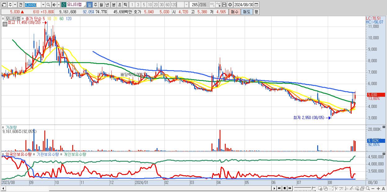 - 모니터랩 (5,030원 ▲ 13.8% , 시총: 616억, 거래량: 9,161,608, 거래대금:457억)
