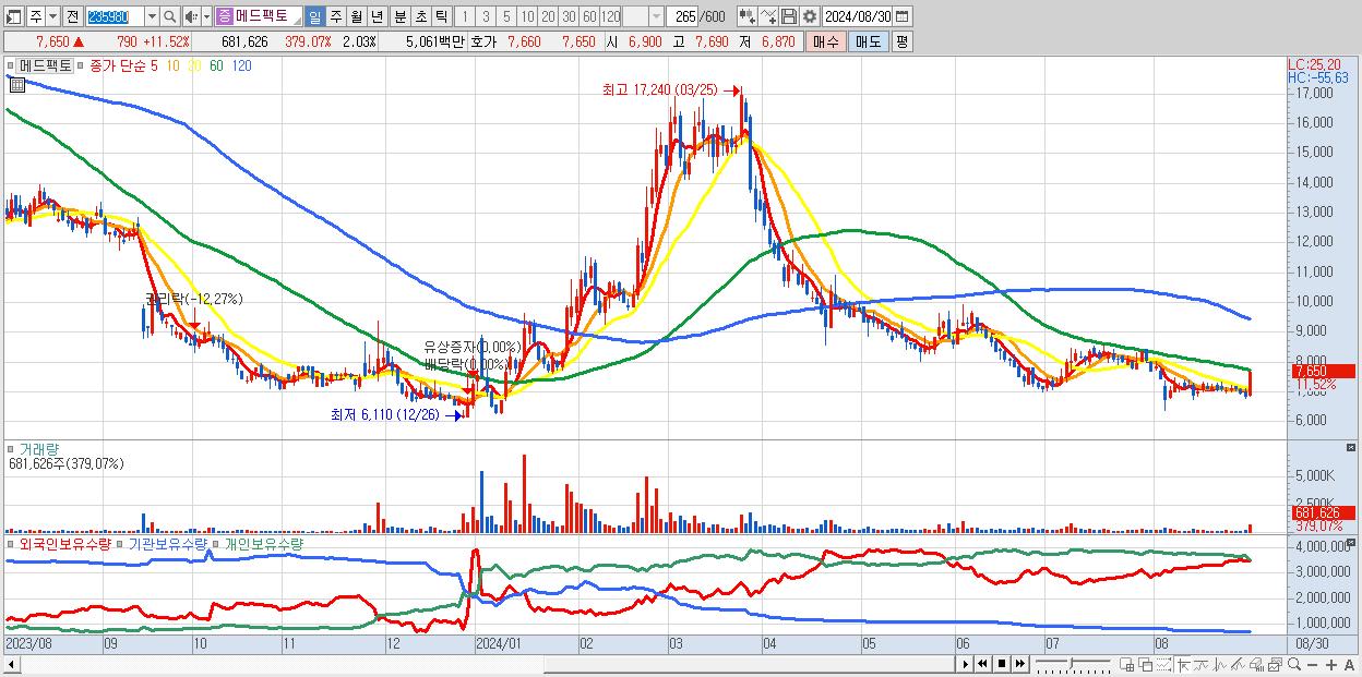 - 메드팩토 (7,650원 ▲ 11.52% , 시총: 2,569억, 거래량: 681,626, 거래대금:51억)