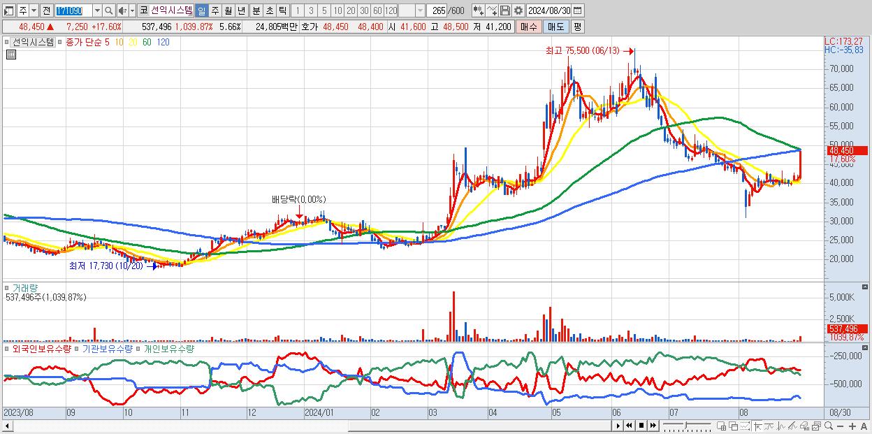 - 선익시스템 (48,450원 ▲ 17.6% , 시총: 4,600억, 거래량: 537,496, 거래대금:248억)