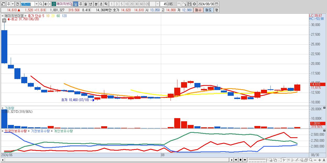 - 에이치브이엠 (14,610원 ▲ 11.61% , 시총: 1,739억, 거래량: 1,001,327, 거래대금:144억)