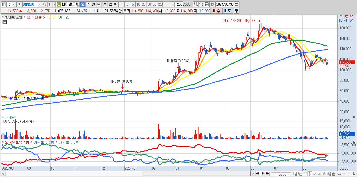 - 한미반도체 (114,500원 ▲ 2.97% , 시총: 111,058억, 거래량: 1,075,656, 거래대금:1,216억)