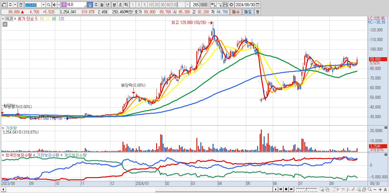- HLB (89,800원 ▲ 5.52% , 시총: 117,499억, 거래량: 3,254,041, 거래대금:2,935억)