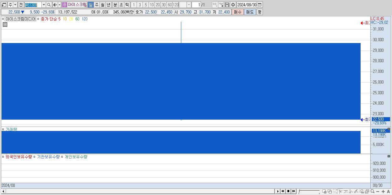 - 아이스크림미디어 (22,500원 ▼ -29.69% , 시총: 2,939억, 거래량: 13,197,522, 거래대금:3,451억)
