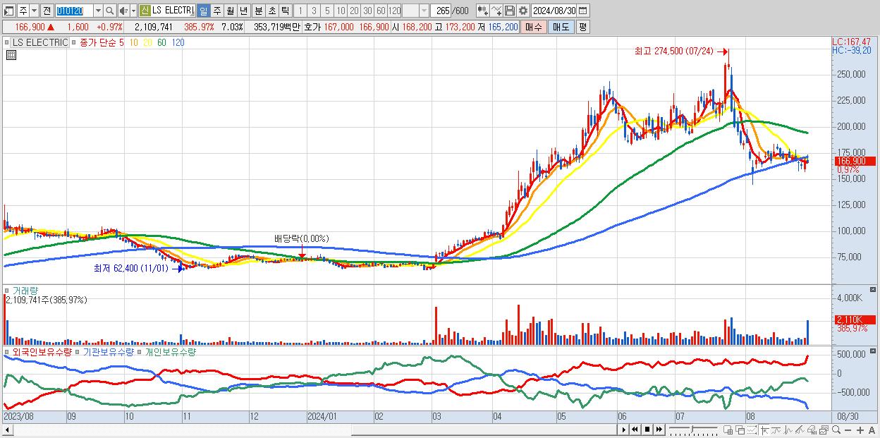 - LS ELECTRIC (166,900원 ▲ 0.97% , 시총: 50,070억, 거래량: 2,109,741, 거래대금:3,537억)