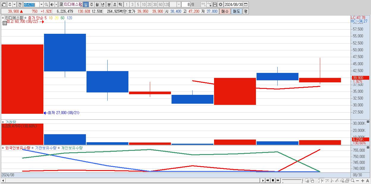 - 티디에스팜 (39,900원 ▲ 1.92% , 시총: 2,206억, 거래량: 6,226,479, 거래대금:2,649억)