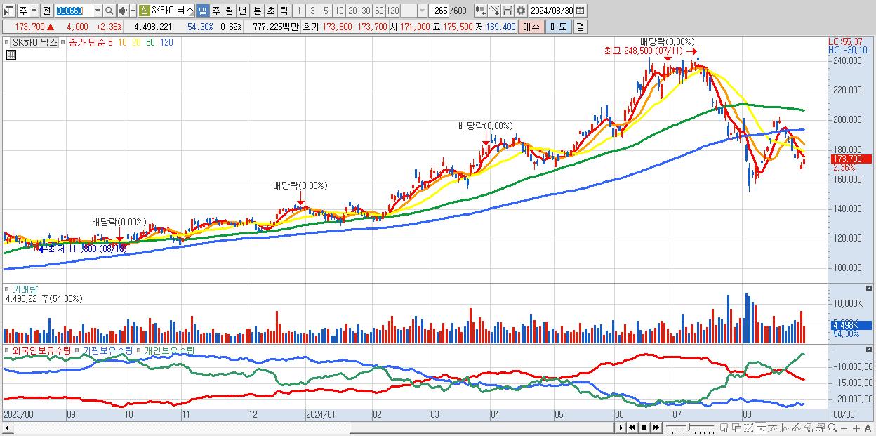 - SK하이닉스 (173,700원 ▲ 2.36% , 시총: 1,264,540억, 거래량: 4,498,221, 거래대금:7,772억)