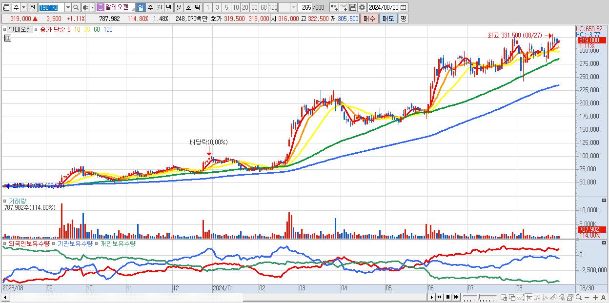 - 알테오젠 (319,000원 ▲ 1.11% , 시총: 169,544억, 거래량: 787,982, 거래대금:2,481억)