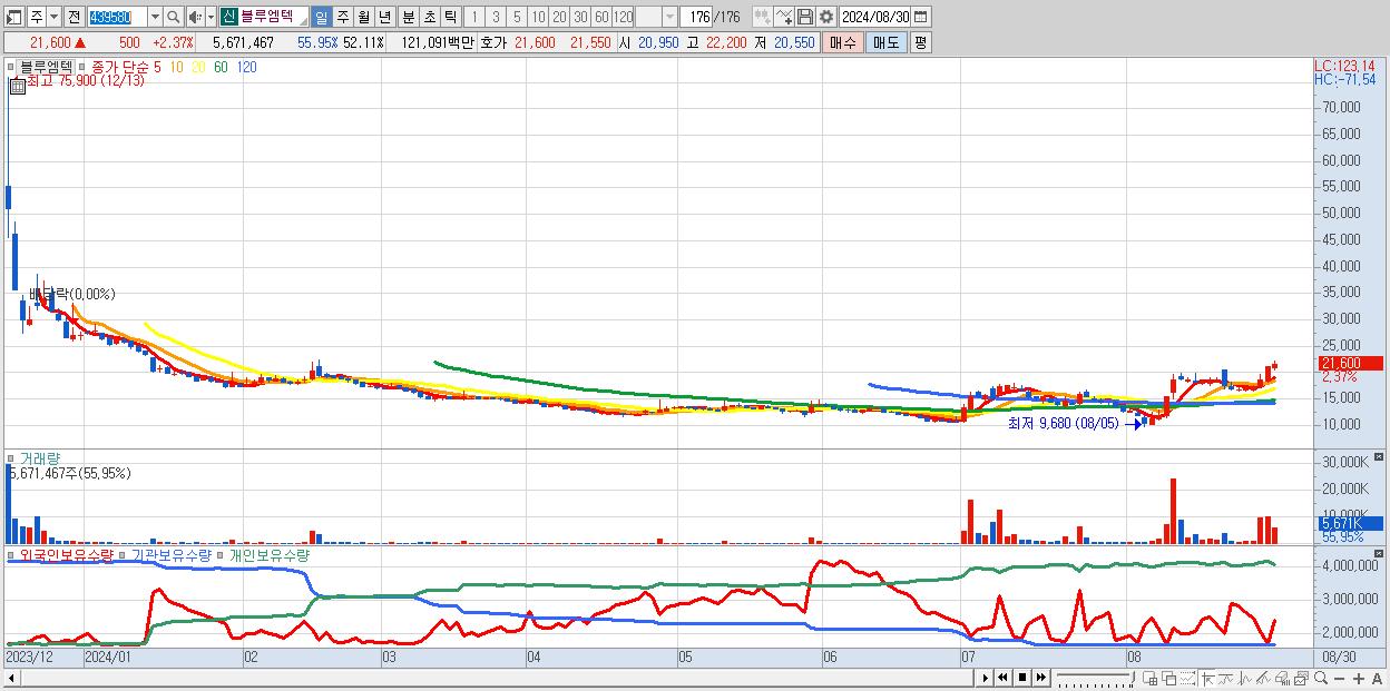 - 블루엠텍 (21,600원 ▲ 2.37% , 시총: 2,351억, 거래량: 5,671,467, 거래대금:1,211억)