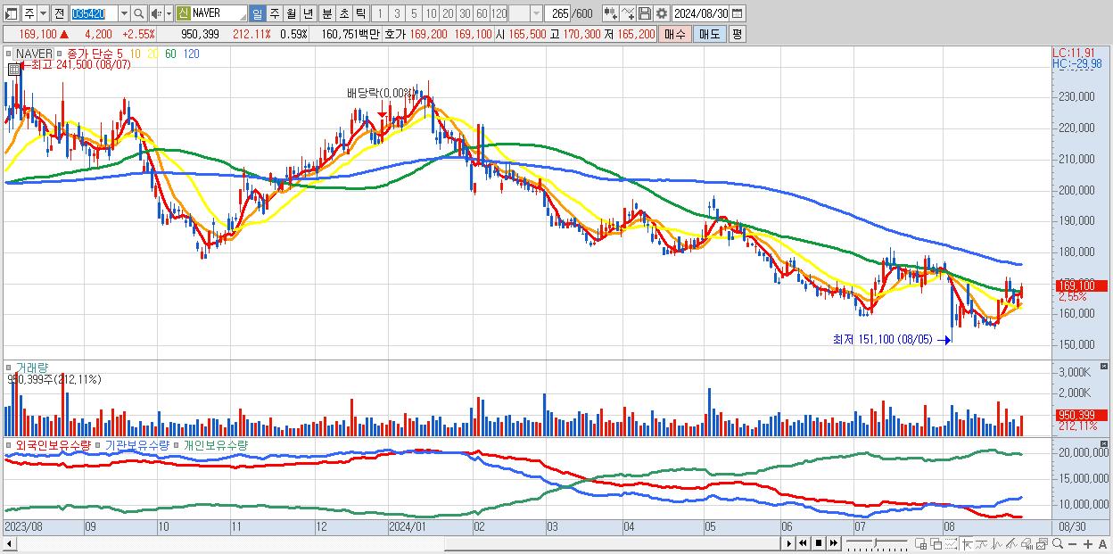 - NAVER (169,100원 ▲ 2.55% , 시총: 271,887억, 거래량: 950,399, 거래대금:1,608억)