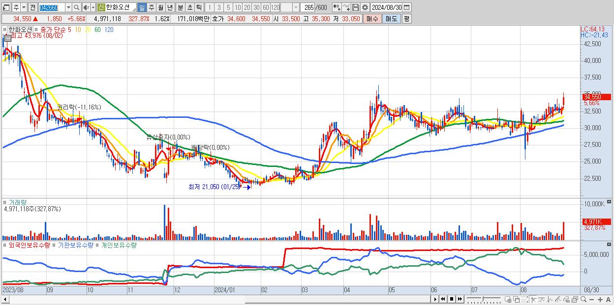 - 한화오션 (34,550원 ▲ 5.66% , 시총: 105,866억, 거래량: 4,971,118, 거래대금:1,710억)