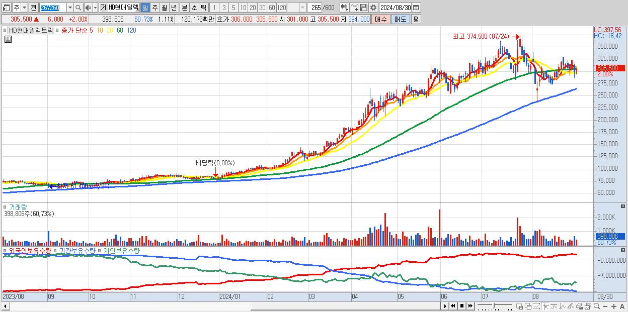 - HD현대일렉트릭 (305,500원 ▲ 2% , 시총: 110,124억, 거래량: 398,806, 거래대금:1,202억)