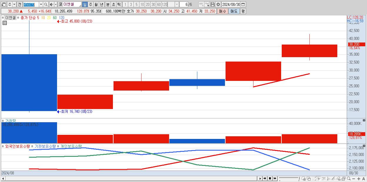 - 이엔셀 (38,200원 ▲ 16.64% , 시총: 3,572억, 거래량: 18,265,499, 거래대금:6,882억)