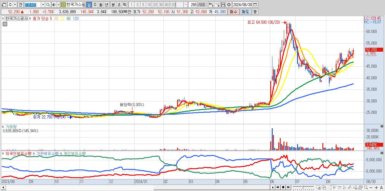 - 한국가스공사 (52,200원 ▲ 3.78% , 시총: 48,187억, 거래량: 3,639,889, 거래대금:1,885억)