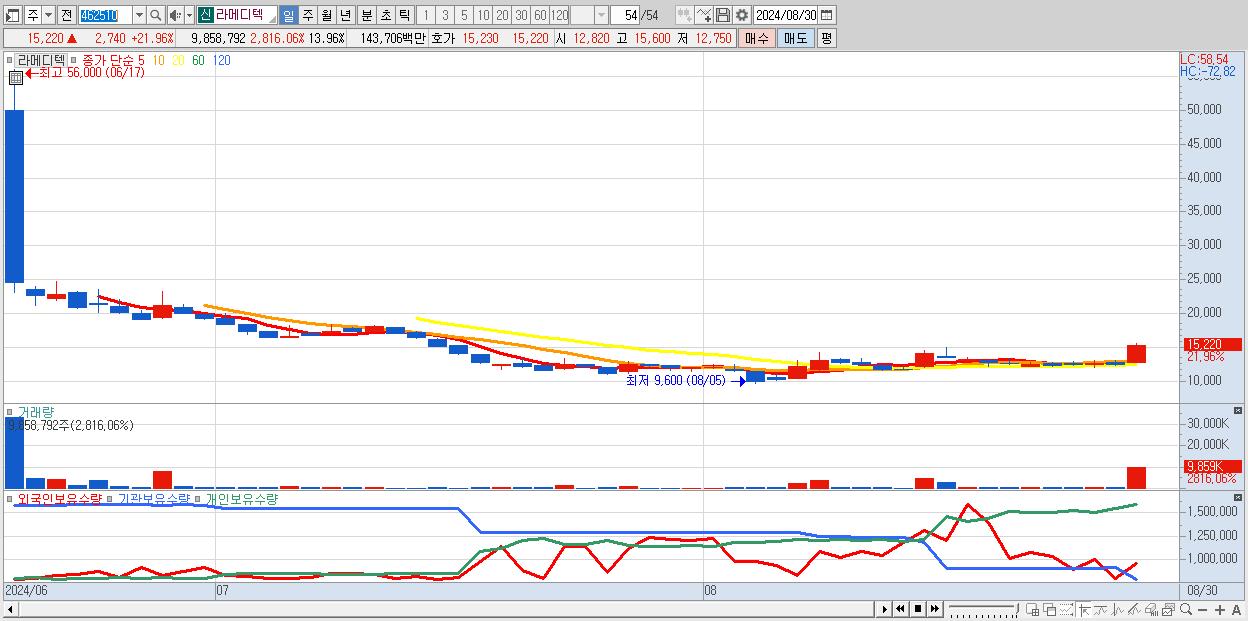 - 라메디텍 (15,220원 ▲ 21.96% , 시총: 1,317억, 거래량: 9,858,792, 거래대금:1,437억)