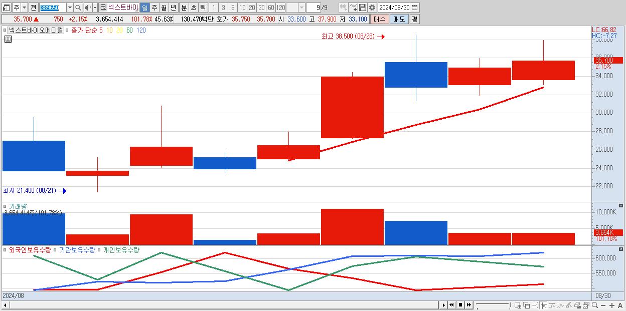 - 넥스트바이오메디컬 (35,700원 ▲ 2.15% , 시총: 2,859억, 거래량: 3,654,414, 거래대금:1,305억)