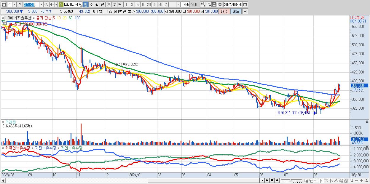 - LG에너지솔루션 (388,000원 ▼ -0.77% , 시총: 907,920억, 거래량: 316,463, 거래대금:1,226억)