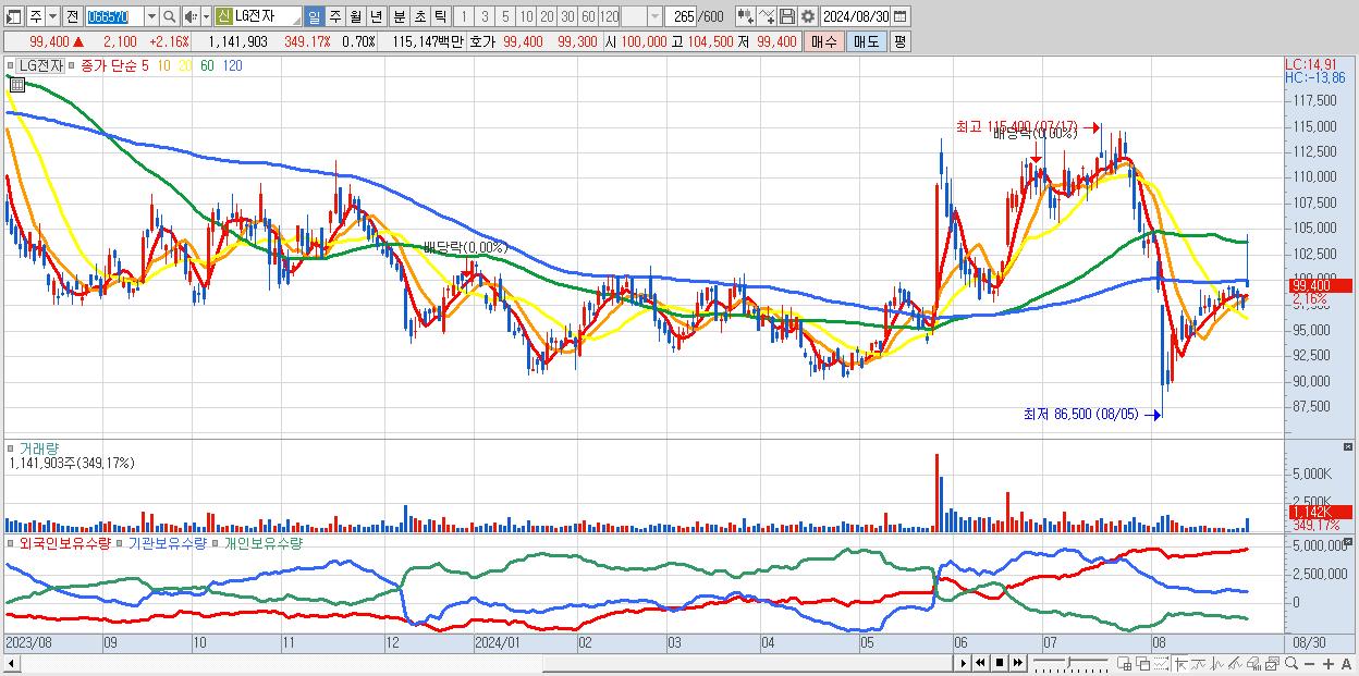 - LG전자 (99,400원 ▲ 2.16% , 시총: 162,666억, 거래량: 1,141,903, 거래대금:1,151억)