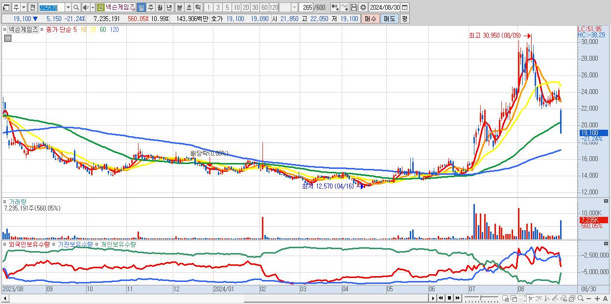 - 넥슨게임즈 (19,100원 ▼ -21.24% , 시총: 12,577억, 거래량: 7,235,191, 거래대금:1,439억)
