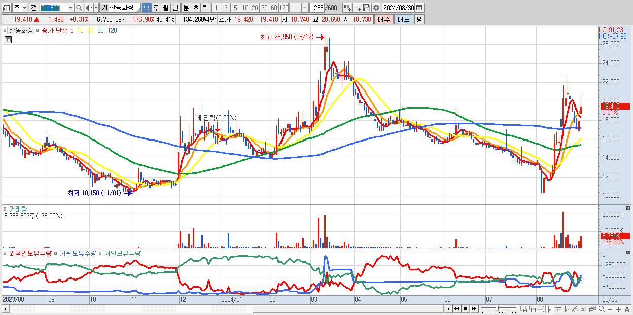 - 한농화성 (19,410원 ▲ 8.31% , 시총: 3,035억, 거래량: 6,788,597, 거래대금:1,343억)