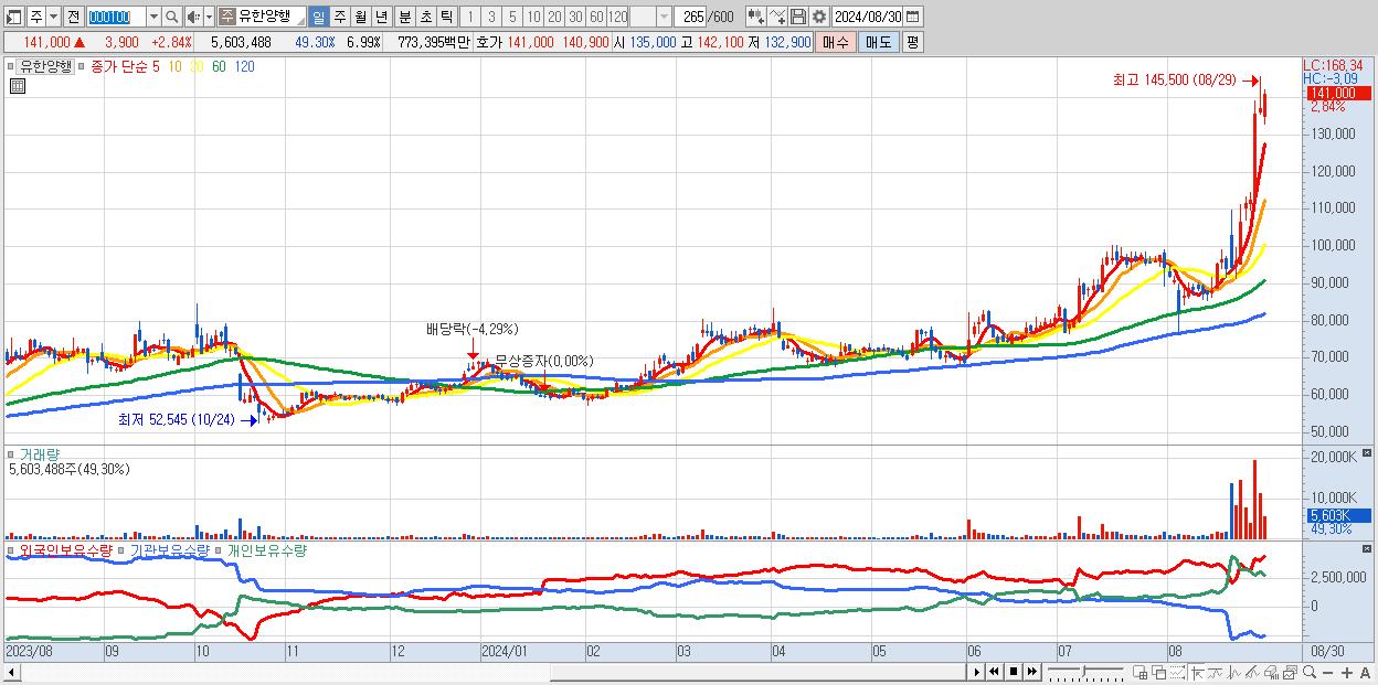- 유한양행 (141,000원 ▲ 2.84% , 시총: 113,095억, 거래량: 5,603,488, 거래대금:7,734억)