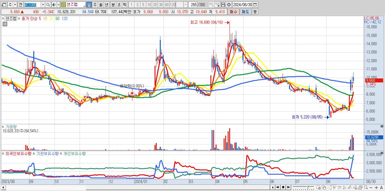 - 샌즈랩 (9,660원 ▲ 5.34% , 시총: 1,473억, 거래량: 10,628,331, 거래대금:1,074억)