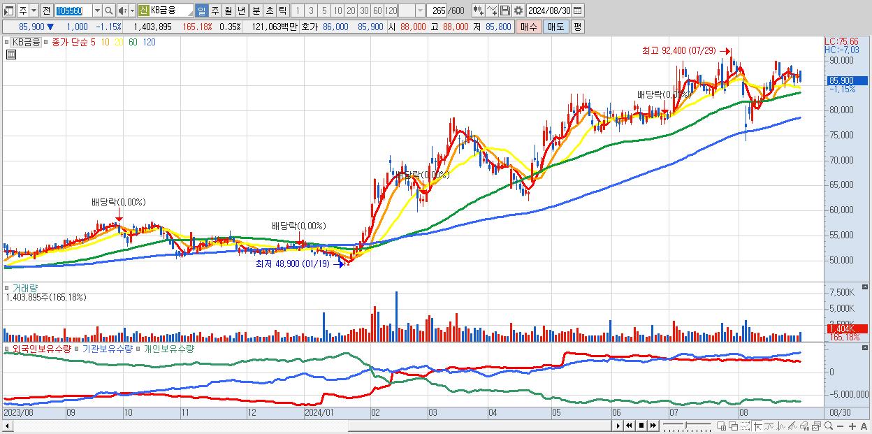 - KB금융 (85,900원 ▼ -1.15% , 시총: 346,616억, 거래량: 1,403,895, 거래대금:1,211억)