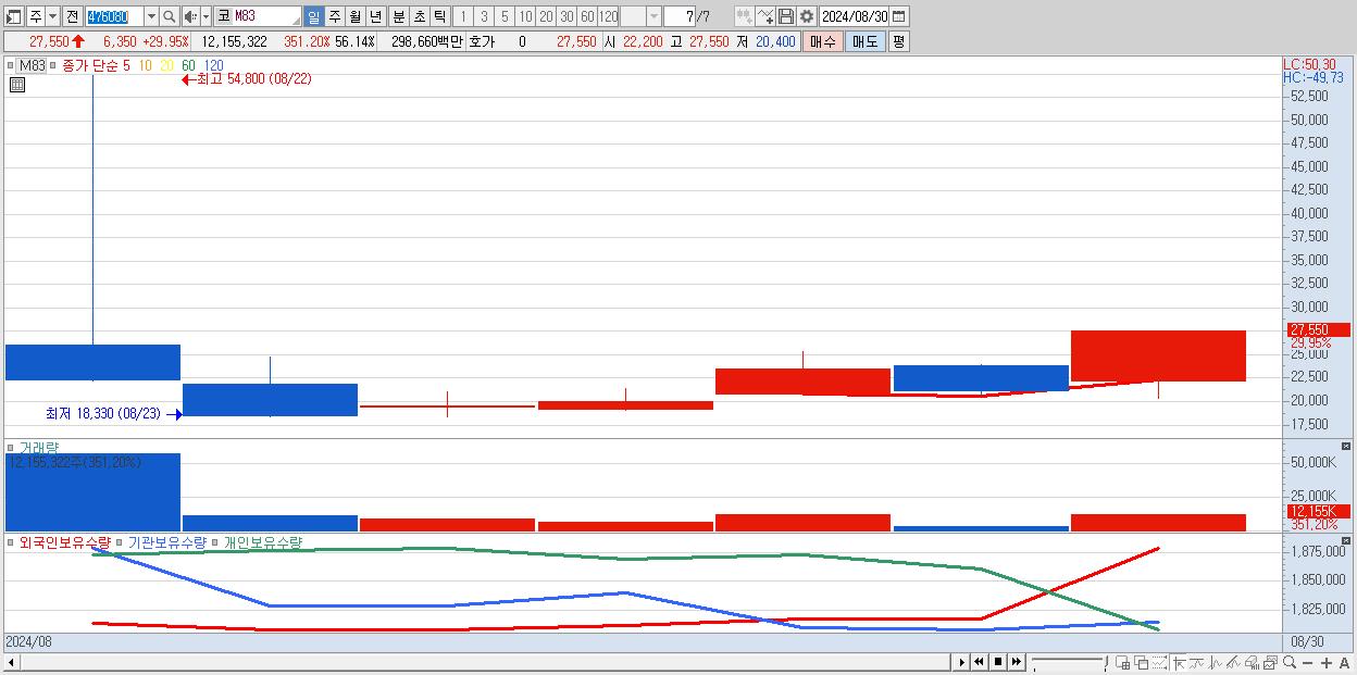 - M83 (27,550원 ▲ 29.95% , 시총: 2,145억, 거래량: 12,155,322, 거래대금:2,987억)