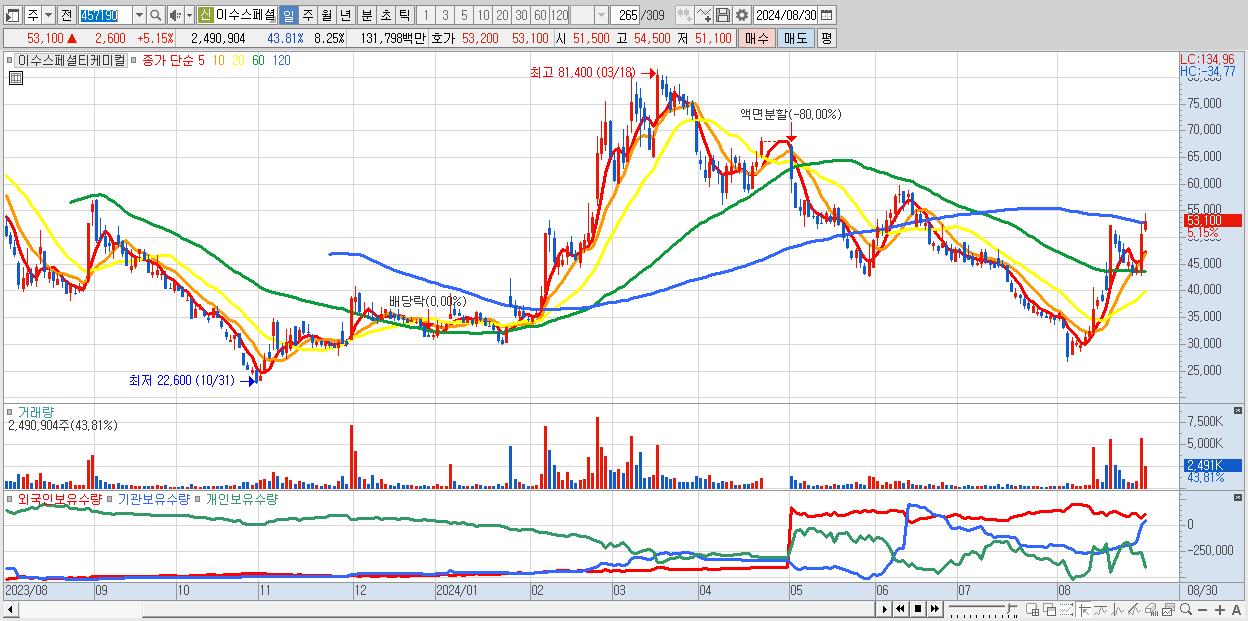 - 이수스페셜티케미컬 (53,100원 ▲ 5.15% , 시총: 16,041억, 거래량: 2,490,904, 거래대금:1,318억)