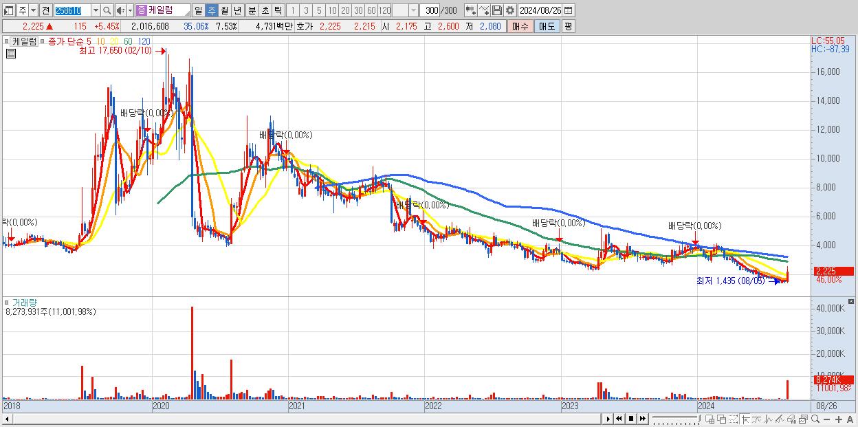- 케일럼 (2,225원 ▲ 46% , 시총: 596억, 거래량: 8,273,931, 거래대금:192억)
