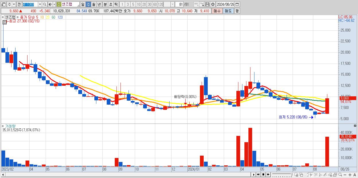 - 샌즈랩 (9,660원 ▲ 54.07% , 시총: 1,473억, 거래량: 35,013,528, 거래대금:3,278억)
