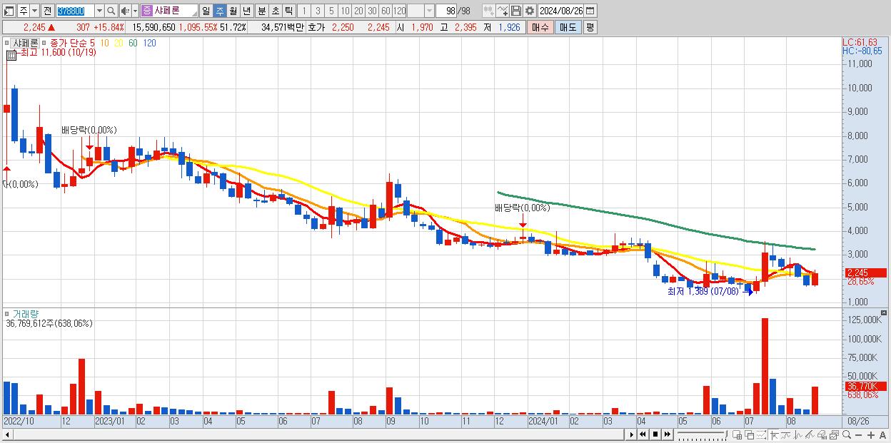 - 샤페론 (2,245원 ▲ 28.65% , 시총: 677억, 거래량: 36,769,612, 거래대금:781억)