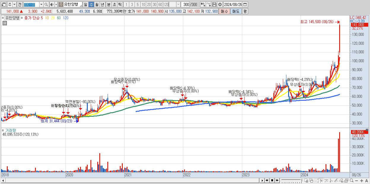 - 유한양행 (141,000원 ▲ 32.27% , 시총: 113,095억, 거래량: 48,095,533, 거래대금:61,734억)