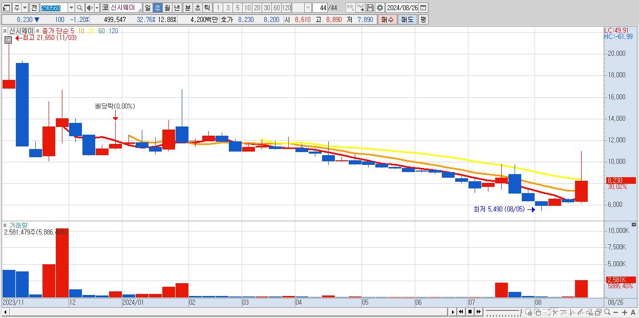 - 신시웨이 (8,230원 ▲ 30.02% , 시총: 319억, 거래량: 2,581,479, 거래대금:229억)