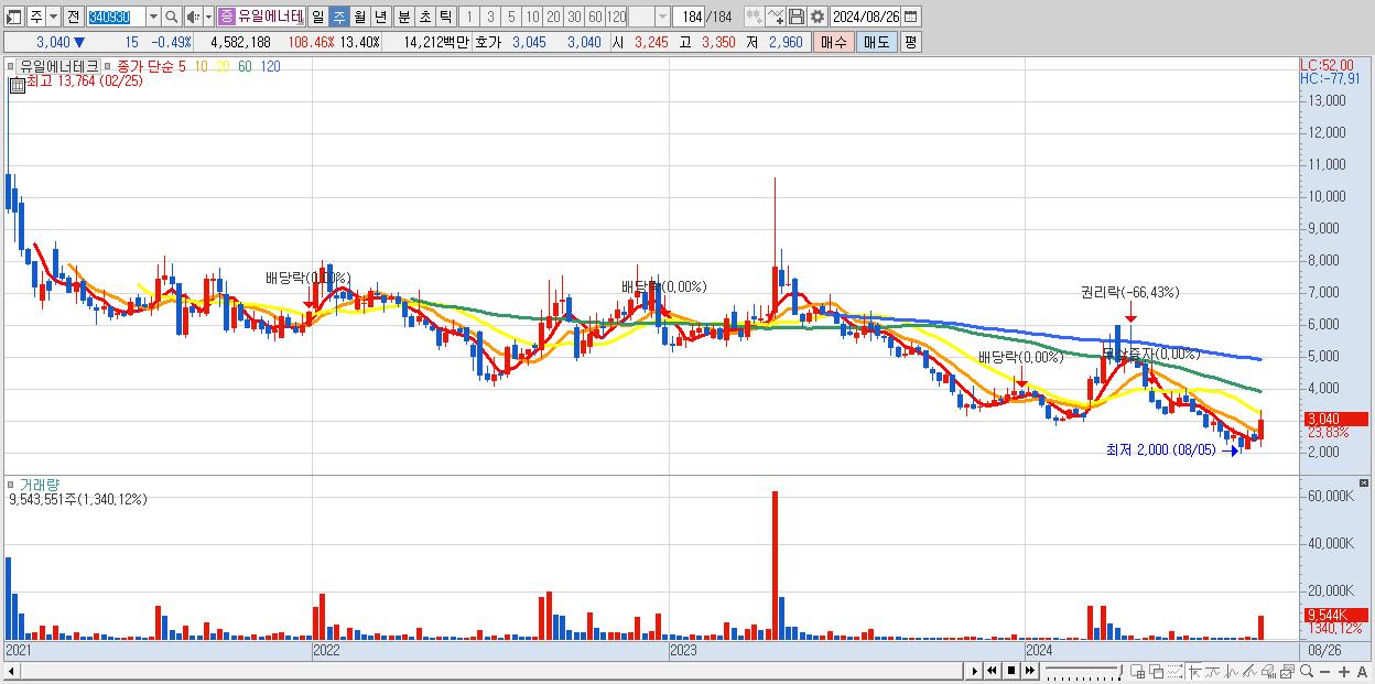 - 유일에너테크 (3,040원 ▲ 23.83% , 시총: 1,040억, 거래량: 9,543,551, 거래대금:280억)