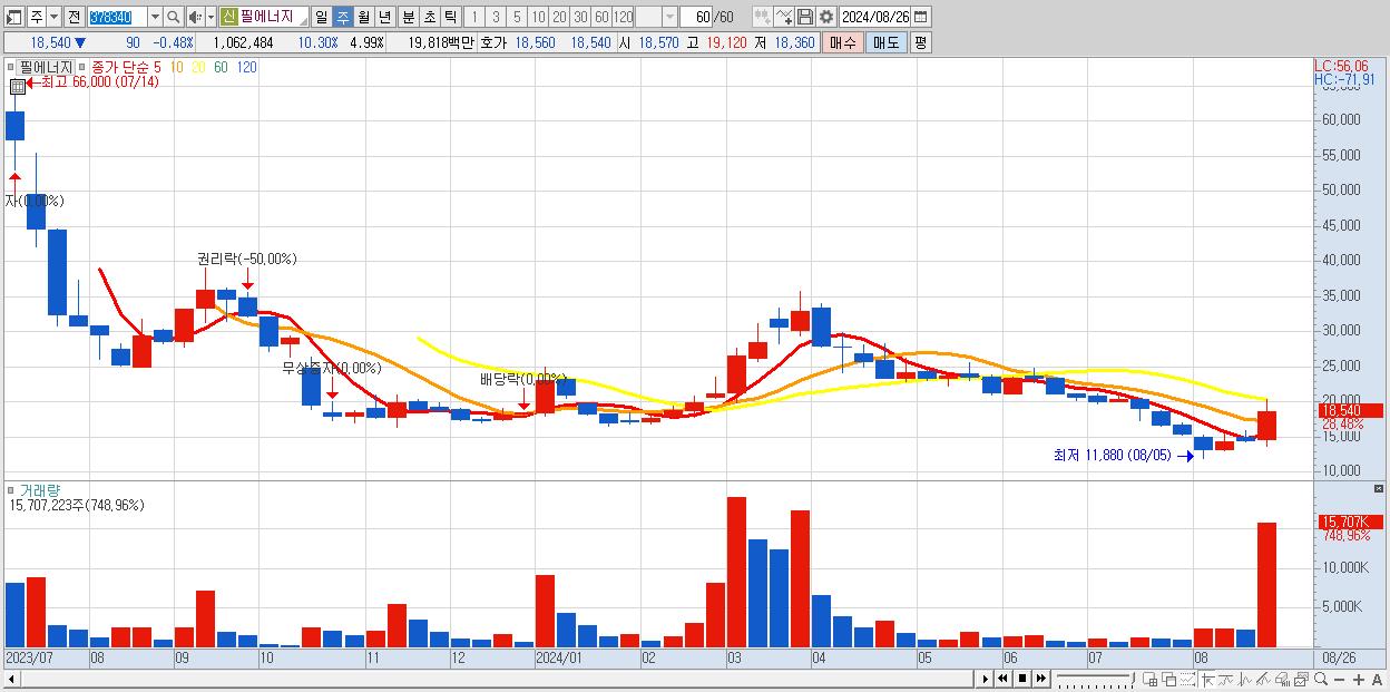 - 필에너지 (18,540원 ▲ 28.48% , 시총: 3,946억, 거래량: 15,707,223, 거래대금:2,890억)