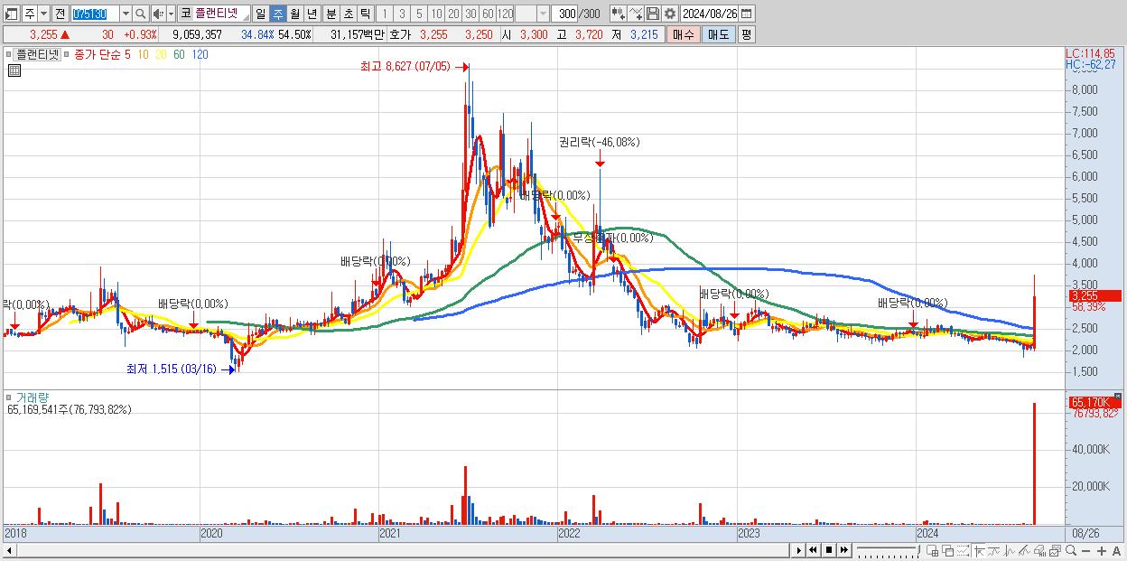 - 플랜티넷 (3,255원 ▲ 58.39% , 시총: 541억, 거래량: 65,169,541, 거래대금:2,039억)
