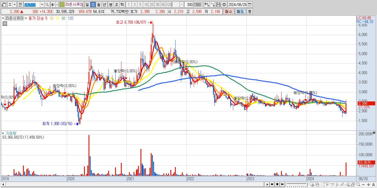 - 라파스 (21,600원 ▲ 24.5% , 시총: 1,925억, 거래량: 5,676,387, 거래대금:1,163억)
