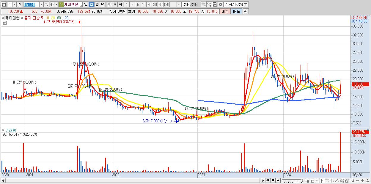 - 케이엔솔 (18,530원 ▲ 26.48% , 시총: 2,409억, 거래량: 20,166,517, 거래대금:3,662억)