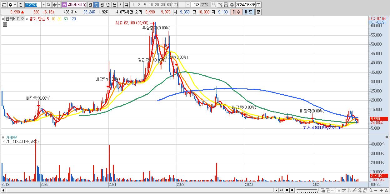 - 압타바이오 (9,990원 ▲ 24.88% , 시총: 2,228억, 거래량: 2,710,413, 거래대금:252억)
