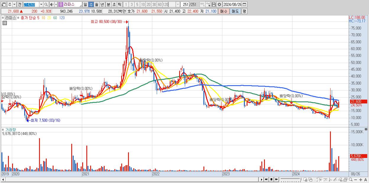 29.라파스 21,600원 ▲ 24.5% (KOSDAQ, 214260)