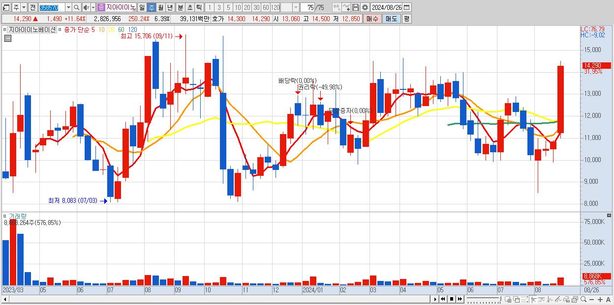 - 지아이이노베이션 (14,290원 ▲ 31.95% , 시총: 6,319억, 거래량: 8,868,264, 거래대금:1,144억)