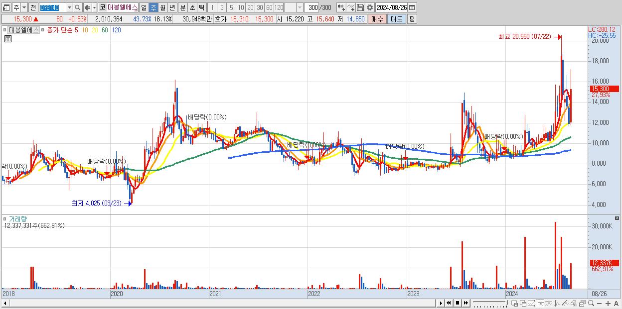 - 대봉엘에스 (15,300원 ▲ 27.93% , 시총: 1,696억, 거래량: 12,337,331, 거래대금:1,853억)